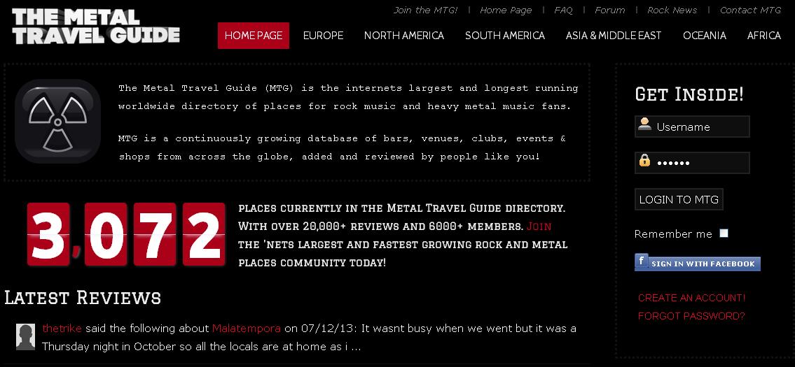 “The Metal Travel Guide (MTG) is the internets largest and longest running worldwide directory of places for rock music and heavy metal music fans.